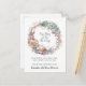 An elegant pregnancy announcement with delicate watercolor floral frame wreath and a modern trendy script typeface. Pretty soft colours in pale pinks, blues and greens.