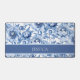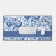Elegant Floral Pattern Blue and White Chinoiserie Desk Mat features an elegant all-over botanical pattern inspired by classic chinoiserie artwork, blending detailed blossoms and foliage in soft blue and white tones. The intricate floral illustration creates a timeless, vintage-inspired aesthetic while maintaining a clean and refined look. A coordinating solid blue name band across the center adds structure and contrast, highlighting the personalized family name in crisp, classic typography.