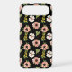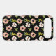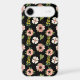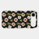 A stylish and elegant floral seamless pattern featuring soft pink flowers, white blossoms, yellow accents, and green leaves on a bold black background.
