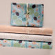 Elegant floral patterns in blue, peach, and green. Trio of patterns: one tossed floral pattern, one peach large bloom shapes, and the third peach marks on white. Great wrapping paper for all celebrations! Designs by Jenn Steffen for Studio Posies.