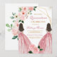 Celebrate a milestone in style with this elegant floral Quinceañera invitation. Featuring pink roses, lush greenery, and gold geometric accents, this design beautifully highlights the sophistication of the occasion. The charming illustration of two girls in pink ball gowns adds a festive and personal touch, making it perfect for honoring a special young lady. Ideal for family gatherings and formal celebrations, this invitation sets the tone for an unforgettable evening.