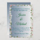 This elegant wedding invitation features a sophisticated silver-to-blue gradient background adorned with a delicate white and pink floral border. The design is accented with subtle bubble or dewdrop elements, creating a fresh and dreamy atmosphere. Perfect for spring or summer weddings, this invitation combines classic calligraphy with a modern aesthetic. Completely customizable with your own wedding details.