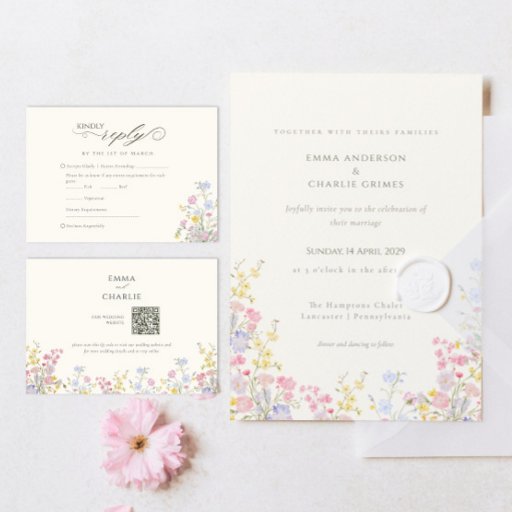 Elegant Floral Wildflower Calligraphy QR Code RSVP Wedding Card with elegant calligraphy and Script ideal for a Spring Summer wedding