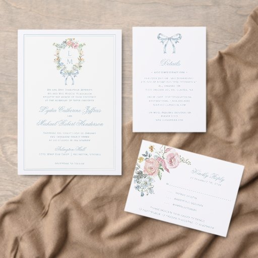The elegant watercolor wreath border gives this wedding invitation a beautiful and timeless look that any sophisticated bride will love. Personalize this invitation with your initials inside the crest at the top.