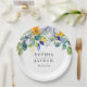 A radiant colourful wedding paper plates with beautiful watercolor green botanical foliage and eucalyptus leaves and sunny elegant yellow white flowers. Enhance your wedding table setting with these elegant floral yellow, white, and blue monogram paper plates. Featuring a sophisticated design adorned with delicate yellow blooms, soft white florals, and charming blue accents, these plates exude timeless beauty and romance. The personalized monogram detail adds a refined and stylish touch, making them perfect for spring and summer weddings. Ideal for garden, beach, or countryside celebrations, these high-quality disposable plates offer both convenience and elegance, ensuring a beautifully coordinated look for your special day.