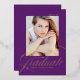 Celebrate your high school or college graduate’s achievement with this elegant photo graduation announcement, featuring a rich purple background and "Graduate" in shimmering gold foil modern calligraphy. Customize it with their senior photo, name, school, and graduation year for a personal touch. The back showcases a sophisticated purple and white trellis pattern, adding a timeless flair. Perfect for sharing this special milestone with family and friends, this custom graduation announcement blends modern elegance with a classic design.