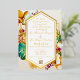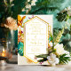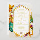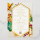 Beautifully elegant formal destination wedding invitation includes a background of lush tropical florals and botanicals around a bright gold geometric frame. Customize the text and section placements to your desired look. This design features a QR Code Mock-up that can delete and replace with your own or delete and replace with your wedding location complete address or the wedding website address.