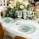 Elegant Wedding plate. Featuring a picturesque fountain, statue adorned with flowers, surrounded by charming trees, and graced by two gentle doves, this design exudes timeless elegance. The intricate details and sophisticated layout set the perfect tone for your special day. Customize with your wedding details