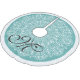 Vintage frontier inspired Christmas tree skirt featuring a faux white lace design over a teal background with white edging. It also includes your family's initial letter in grey script.