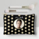 Elevate your style with this elegant black accessory pouch, featuring a chic faux gold circles pattern that pops against the simple black background. Personalize the front with your own photo and name in cute, handwritten white script, making it a truly unique accessory.