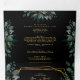 Ideal for a boho wedding, this all-in-one tri-fold invitation showcases a geometric frame intertwined with lush greenery, creating a harmonious blend of elegance and rustic charm. The design embraces moody dark green watercolor leaves and eucalyptus, evoking a modern bohemian woodland ambiance. This comprehensive wedding suite encompasses every element you need, conveniently presented in a single folded invitation.