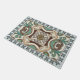 An elegant doormat featuring a beautiful pattern of flourished geometric shapes in greens, cream, tan, blue. An eye catching character filled flowery entryway doormat reminiscent of ancient mosaic tiles.