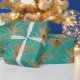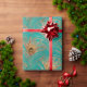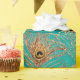 An elegant gift wrap pattern of gold glitter peacock feathers on aqua background