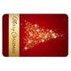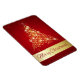 Modern, elegant and festive Christmas illustration featuring a Christmas tree made of shiny stars on a red background with snowflakes and a golden border.