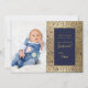 In the left half, there is a placeholder baby photo you should replace. In the right half, the text is written in a vintage floral gold frame with intricate wild roses decorations, on a navy blue background. The role "Godparents" and the name of the child are written in a calligraphic script, the rest in caps. All text has a golden colour, like the gold frame.