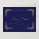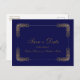 A customizable elegant gold and blue ornate lace save-the-date postcard.
