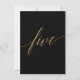 This elegant gold and black calligraphy table number five is perfect for a simple wedding. The neutral design features a minimalist card decorated with romantic and whimsical faux gold foil typography. The card prints on the front and back (double-sided). Other table numbers in the collection are sold separately.