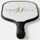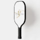 A chic modern stylish pickle ball paddle, featuring a gold black monogram with a dramatic script initial with swashes and your full name. The face of the paddle is a white background with black edges and handle. Simple elegance. The background has a visual textured effect.