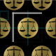 Design with elegant graphic gold scales of justice symbol on black background.