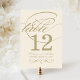 NOTE: Each table number card must be customized and individually added to the shopping cart. Elegant card includes a flourished monogram with champagne gold calligraphy and scroll design accents, and damask pattern on the back of the card.
