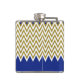 Elegant drinking flask done in a gold tone glitter and white chevron zigzag pattern, with blue accent, on the top, and a solid blue, on the bottom, of the flask. Personalize the white script text for yourself or as a lovely gift idea. Great for bridesmaid's gifts.