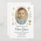 Belle et minimaliste invitation au baptême photo pour une petite fille. Il présente des symboles religieux dessinés à la main, dont une croix d'or, une bougie, un chalice et des étoiles, associés à des accents botaniques gris-bleu doux. Entièrement personnalisable avec les détails de la photo et de la cérémonie de votre enfant.