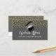 © 2018 Socialite Designs. A beautiful business card that incorporates handwritten script font, gold confetti and a long lash design. The font colours are white and pink, and a grey background.