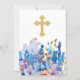 © 2023 Socialite Designs & LICENCORS. Beautiful christening or baptism invitation with a gold cross, gold and floral frame. A wonderful invitation to invite family and friends to attend the event and gathering afterwards.