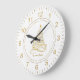 The clock face has complimentary, golden numbers for the hours and marks for the minutes.