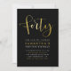 This formal, elegant, trendy, modern fortieth birthday party invitation is suitable for men or women. It features a stylish "Forty" script and simple typography on a black background. On the reverse, there is a faux gold foil art deco pattern.