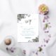 These gorgeous wedding RSVP cards feature a beautiful dark teal and gold design. The front features elegant script lettering with gold foil curls and swirls in the corners on a classic white background. The customizable form is printed in teal ink, for your guests to fill out indicating whether they will attend or not, as well as the number of guests and choice of meals. There is space to enter a webpage URL so your guests can respond online if they prefer. The back is a deep marbled teal color.