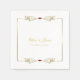 Elegant white wedding napkins featuring an ornate gold frame with a centred red heart featuring the bride and groom's name and their wedding date in gold print.