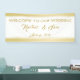 Add this Elegant Wedding Reception Banner to your Reception Accessories. Designed with the text: Welcome To Our Wedding, The Bride and Groom's Names and Wedding Date; and decorated with gold coloured accent stripes top and bottom. To personalize, simply insert your text into our easy template, replacing the sample names and date. Be sure to view the complete Elegant Gold Framed Wedding Collection for matching stationery and accessories.