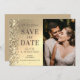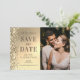 Elegant Gold Glitter Photo Wedding Save The Date Invitation Invite features an elegant brown script on a gold glitter background with your favourite photo. Perfect for weddings, birthday, anniversary, Bat Mitzvah, baby showers, parties and celebrations. Designed for you by © Evco Studio at www.zazzle.com/store/evcostudio
