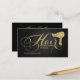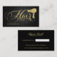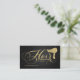 Elegant Gold Glitter Script Hair Stylist Professional Business Cards with black metallic pattern effect background.