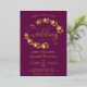 These beautiful wedding invitations feature real pressed foil on a cassis purple, magenta, or berry coloured background. The elegant design features sprigs of wistful leaves and modern script lettering for a style that is both rustic and classy.