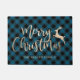 Modern personalized Merry Christmas doormat design which features elegant faux gold handwritten script lettering, beautiful reindeer, black and blue buffalo plaid pattern background. A perfect Christmas gift for new homeowners or newlyweds.