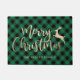 Modern personalized Merry Christmas doormat design which features elegant faux gold handwritten script lettering, beautiful reindeer, black and green buffalo plaid pattern background. A perfect Christmas gift for new homeowners or newlyweds.
