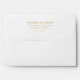This elegant wedding envelope features a minimalist design with clean lines and a sophisticated layout. The gold text on a white background creates a striking contrast, highlighting the names and address in a classic serif font. Perfect for formal occasions, this design exudes a refined and timeless aesthetic, making it ideal for weddings or other special events. Its simplicity allows for easy customization while maintaining an air of elegance and professionalism.