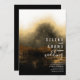 artistic and elegant wedding invitation with golden misty watercolor landscape abstract painting with side bride and groom names, wedding typography and details in front and plani black in back.