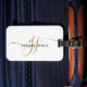 A minimalist gold and black monogram stylish luggage tag on a white background, with a serif typography initials and serif name. Elegant style to dress up your travel accessories.
