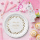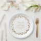 An elegant and traditional olive branch wreath wedding paper plate featuring your names inside a gold olive branch wreath with your numerical wedding date.