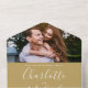 All in one wedding invitation featuring your special photo and elegant gold signature script name and monogram initials on a gold background. The invitation includes a perforated RSVP card that’s can be individually addressed or left blank for you to handwrite your guest's address details. Designed by Thisisnotme©