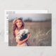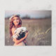This elegant graduation thank you postcard features a full photo and elegant calligraphy. "Thank you" is written in pretty gold script in the lower right corner, with the graduate's name and graduation year below in white. This gold and white typography design overlays a full photo of the new graduate (horizontal/landscape orientation). On the back, you can write a custom message to recipients, or delete the template text to create a blank area for a handwritten note.
