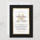 Invite your guests to help you celebrate your special day with this elegant invitation featuring modern script, black and gold text including artistic kissing seahorses and a metallic gold foil frame on the front of the card. A black background is on the front and back.