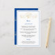 This elegant coastal wedding reception menu features a stylish gold seashell and waves design with a blue border. Reverses to gold seashell pattern on blue background. Perfect for beach, summer, or nautical theme weddings. Design©Rosalind Moore, Cherry Lane Designs.