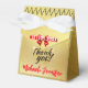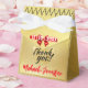 Express your gratitude with this elegant gold wedding favour box, personalized with the couple's names and special date. Designed with a luxurious white ribbon and a chic gold texture, this favour box adds a touch of class to any wedding celebration. Perfect for gifting sweets, small keepsakes, or special tokens of appreciation. Make your big day unforgettable with this custom-designed thank you box