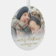 Elegant Gold and White Hand Lettered "Merry Christmas" Script Couple Photo Ornament. Features your favourite family photo, "Merry Christmas" calligraphy text in handwritten script, family name and year. Easy to personalize it. Photo tip: crop your photo to square form before upload it.