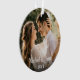 Elegant, personalized photo ornament keepsake for newlywed married couple with custom text in white for names and the year and design that includes elegant gold heart details.