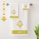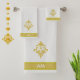 Golden fleur de Lis, monogram and stripe on white. Elegant modern towel set. Image only on one side.